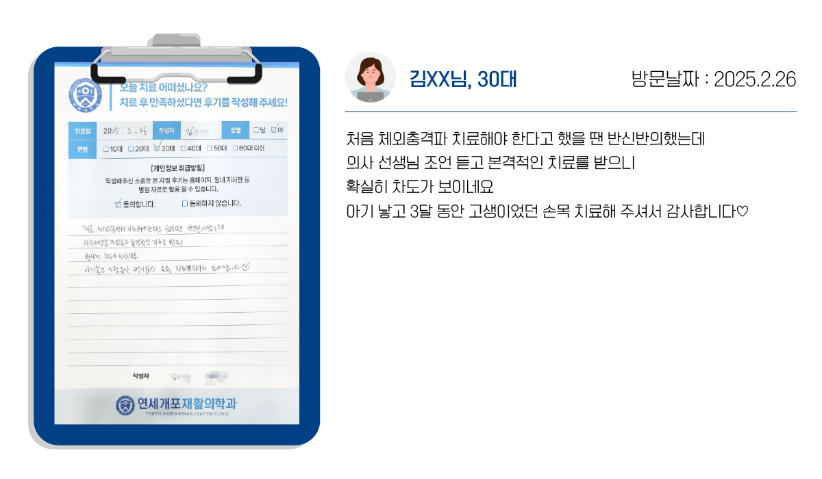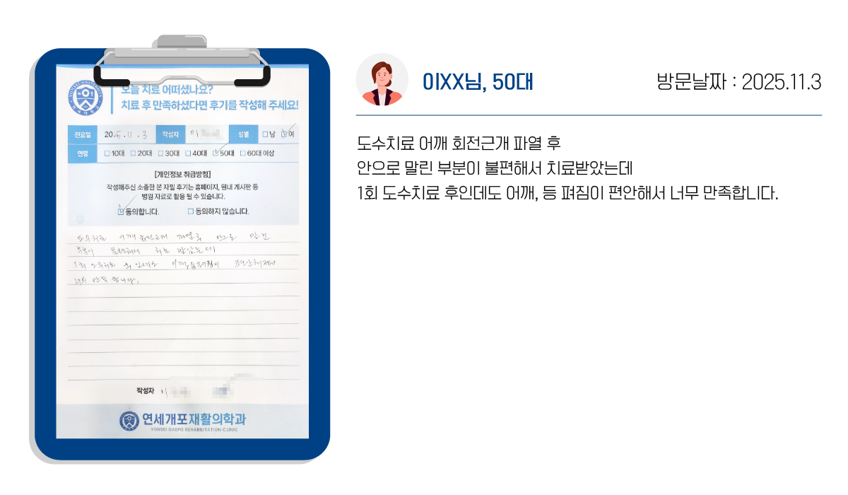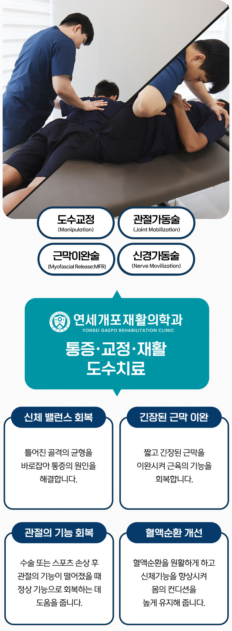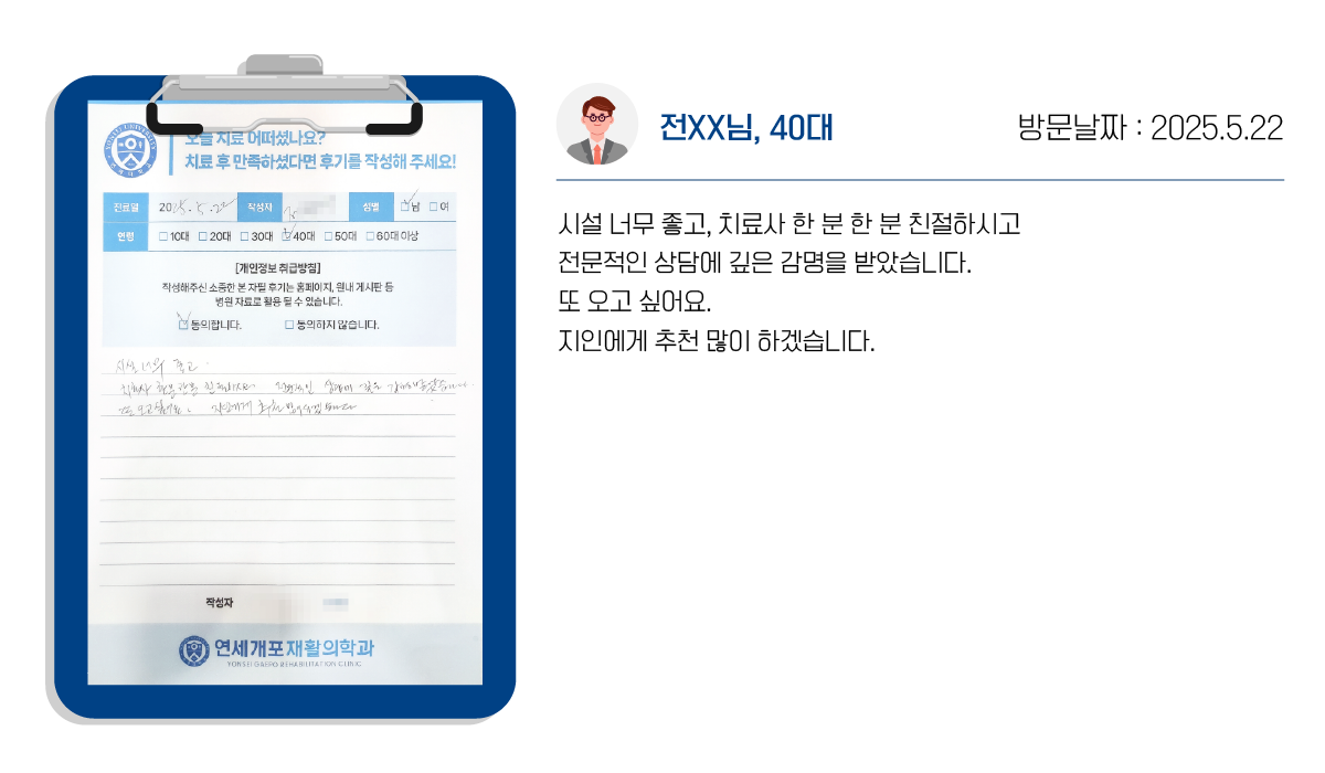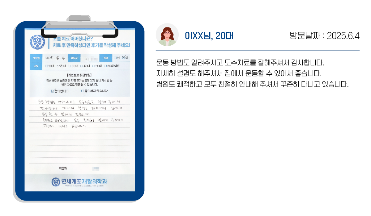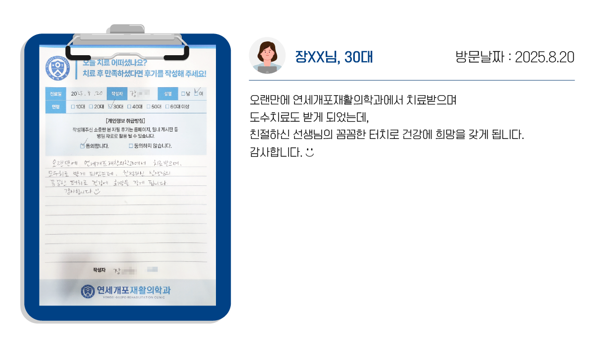 연세개포재활의학과의 도수치료는 통증->교정->재활의 단계로 증상의 호전뿐 아니라, 재발을 최소화합니다.